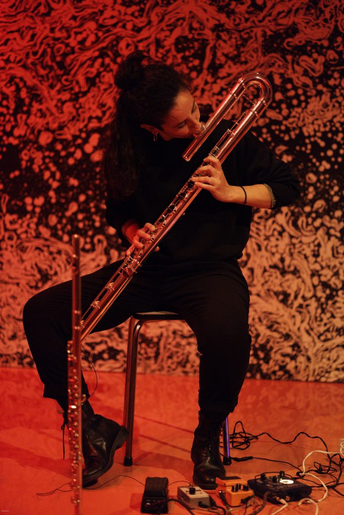 Soavtorja: Bogdana Herman — glas, govor, petje Borut Savski — dihala, brenkala, računalnik ![]() Skozi nastop se zvrsti troje konceptov: govorno-pevsko-plesno — in tako poudari trojstvo funkcionalnosti glasbe. Vse to na neobičajen način in z neobičajnimi sredstvi — da se doseže potujitev primarnega glasbenega efekta in odpre prostor razmisleku. Bogdana Herman, profesorica slavistike in učiteljica veščin sporazumevanja, pesnica, raziskovalka in pevka ljudskih pesmi je ena izmed pionirk, ki je zvene, zvoke in vsebine ljudske glasbe spojila z današnjimi zvočnimi praksami in razprla tenko navidezno linijo, ki naj bi ljudskost ločevala od sodobnosti, med ljudskim in umetnim. Posnela je vrsto plošč, nastopala v 23 državah sveta, ustvarjala radijske in TV oddaje o slovenskih ljudskih pesmih, narečjih in govorih, uvrstila petje v filme, TV dokumentarce in gledališke predstave. Je tudi članica ponovno obujene legendarne zasedbe Salamander, ki v sodobni maniri in skozi improvizacijo uglasbljuje poezijo Milana Dekleve. Borut Savski je pionir zvočne umetnosti, njen temeljni sotvorec v našem prostoru. Je intermedijski umetnik, tvorec zvočnih in interaktivnih orodij ter mehanizmov, založnik (Trivia Records), radijski umetnik (Ministrstvo za eksperiment, Radio Študent), tvorec novih umetniških paradigem, prostorov in skupnosti (Cirkulacija 2), mislec zvoka (Huda ura), eden prvih avtorjev zvočnih postavitev v naših galerijskih prostorih in glasbenik, ki o glasbi in zvoku razmišlja drugače — povsem samosvoje. Zagovornik pojma neglasbe — kot področja drugačnega koordinatnega sistema kakor v glasbi. + KAKALIAGOU / TANTANOZI (GR/CH/AT) Elena Kakaliagou — rog Marina Tantanozi — flavta ![]() Elena Margarita Kakaliagou, rojena 1979, je grško-avstrijska glasbenica na rogu, ki trenutno živi v Berlinu. V zadnjih 20 letih je z rogom razvila svoj lasten glasbeni besednjak z razširitvijo znanih zvočnih parametrov od liričnega zvoka do noiza in nazaj. Deluje v polju sodobne klasične glasbe z uporabo razširjenih tehnik, zvokov vetra, akustičnih ali ojačanih setov in zank. Kakaliagou mednarodno nastopa solo in z velikim številom glasbenikov in izvajalcev ter sodeluje z različnimi področji umetnosti, plesa, filma in slikarstva, med katerimi so Riikka Innanen, Phill Niblock, James Andean, Katharina Klement, CC Hennix, Catherine Lamb, Jules Reidy, Simon Martin, Matias Guerra, Thomas Noll, Kasper T. Toeplitz, Éliane Radigue, Els Vandeweyer, Natalia Manta, Floros Floridis, Didem Pekün, Iris Baglanea in mnogi drugi. Poleg njenega glavnega projekta, Nabelóse in Zinc&Copper, lahko Eleno poslušamo v Stefan Schultze Large Ensemble, zeitkratzer, PARA in na več kot 20 albumih različnih glasbenikov. Izvedla je premiere z ansambli, kot so Ensemble Linea, Circuit Training in Schallfeld, na festivalih, kot so Ultraschall Berlin/DE, Maerz Music/DE, Randspiele/DE, Musica Nova/FI, Musica/FR, New Adits/AT, Ultima/NY, Kaleidophon/AT, newadits/AT, Tour de Babel/FR, Sound Live Tokyo/JA, GMEA/FR, Tektonika/GR, itd. https://www.elenakakaliagou.com/